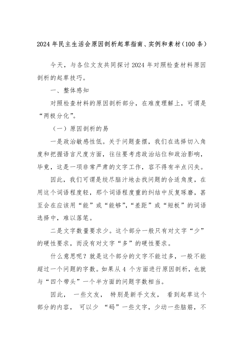 (100条)2024年民主生活会原因剖析起草指南、实例和素材
