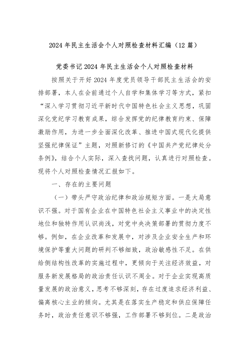 (12篇)2024年民主生活会个人对照检查材料汇编