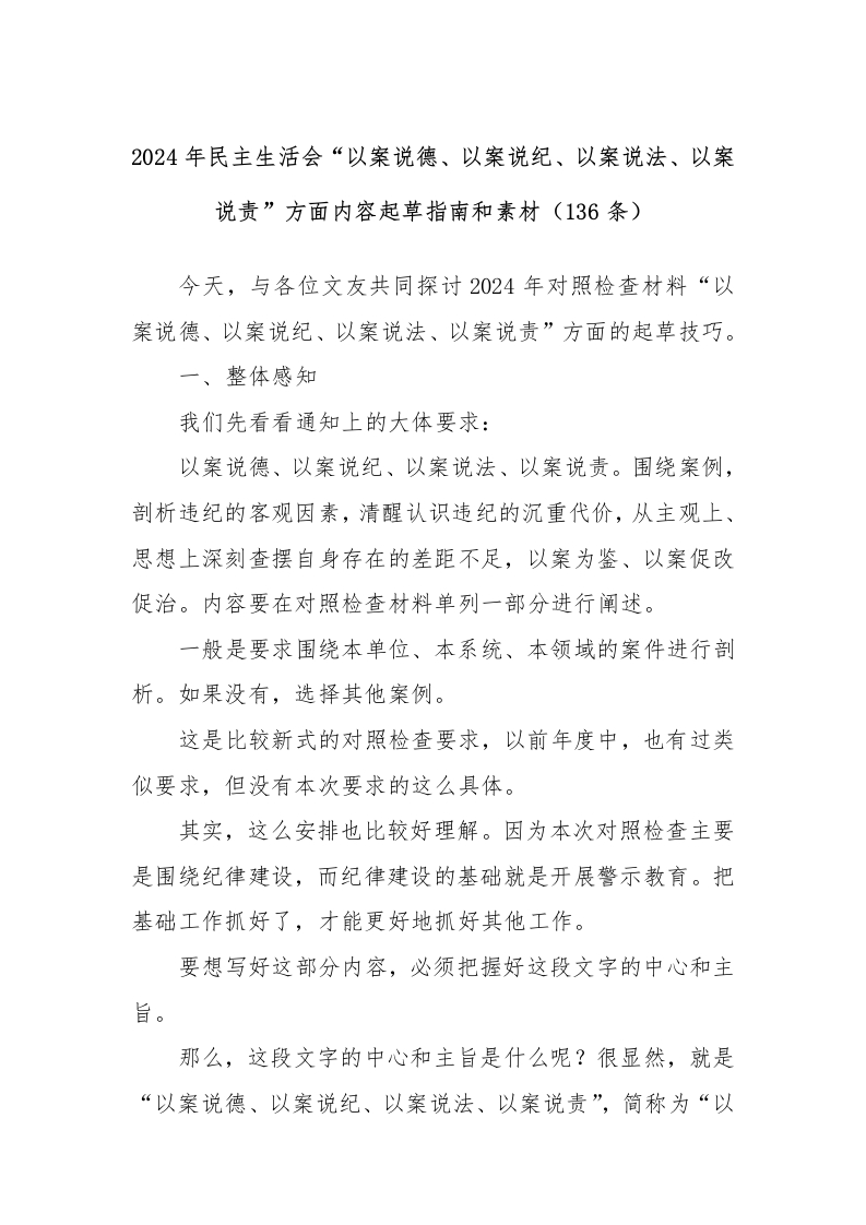 (136条)2024年民主生活会“以案说德、以案说纪、以案说法、以案说责”方面内容起草指南和素材