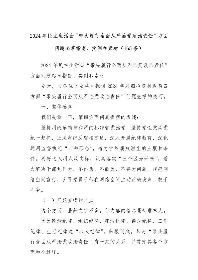 (165条)2024年民主生活会“带头履行全面从严治党政治责任”方面问题起草指南、实例和素材