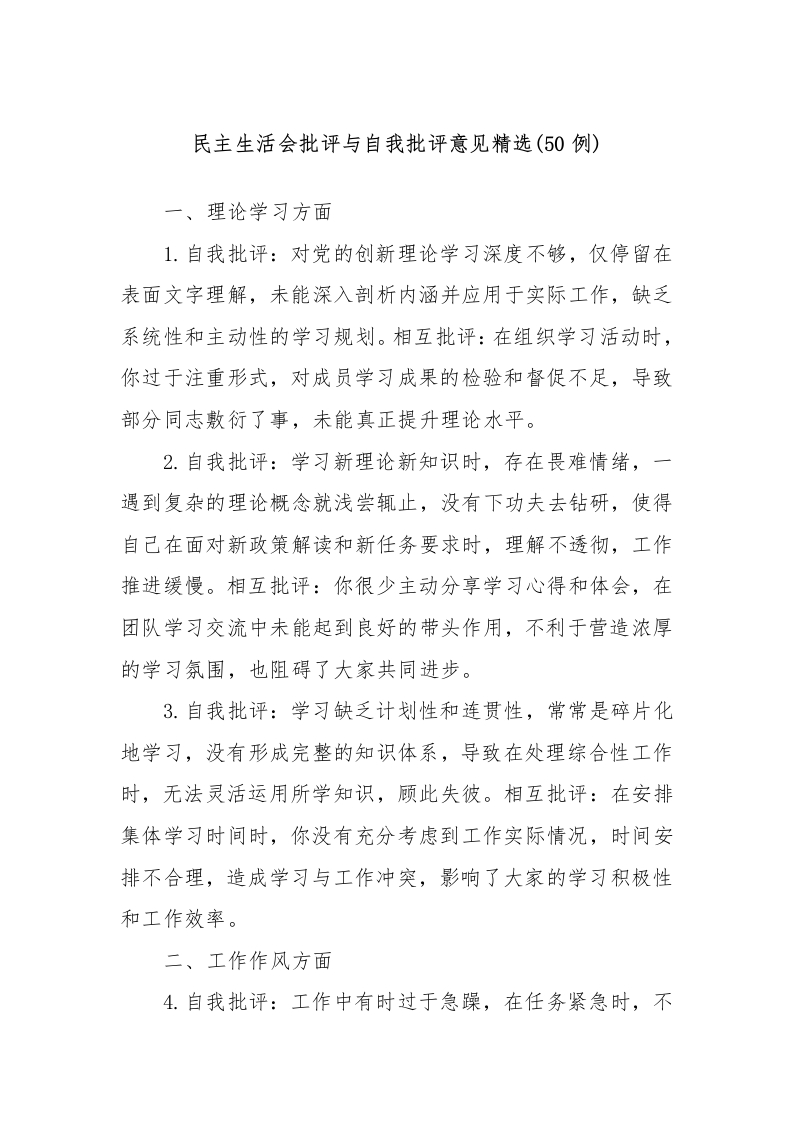 (50例)民主生活会批评与自我批评意见精选