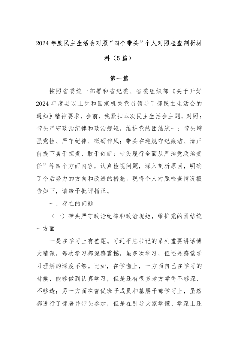 (5篇)2024 年度民主生活会对照 “四个带头” 个人对照检查剖析材料