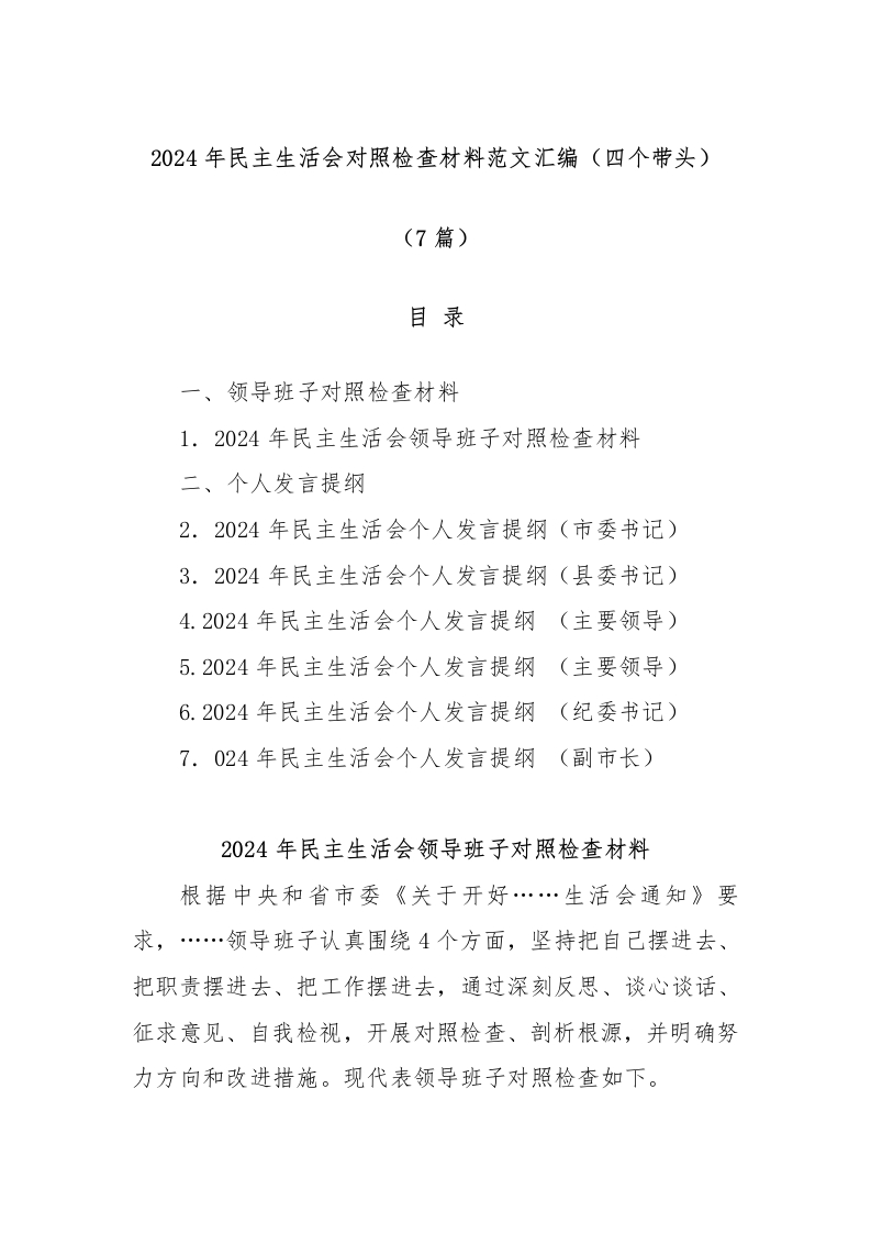 (7篇)2024年民主生活会对照检查材料范文汇编(四个带头)
