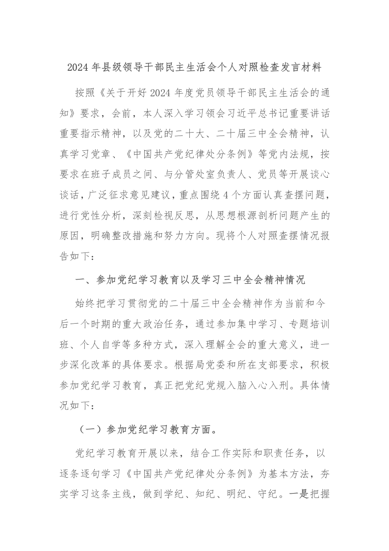 2024年县级领导干部民主生活会个人对照检查发言材料