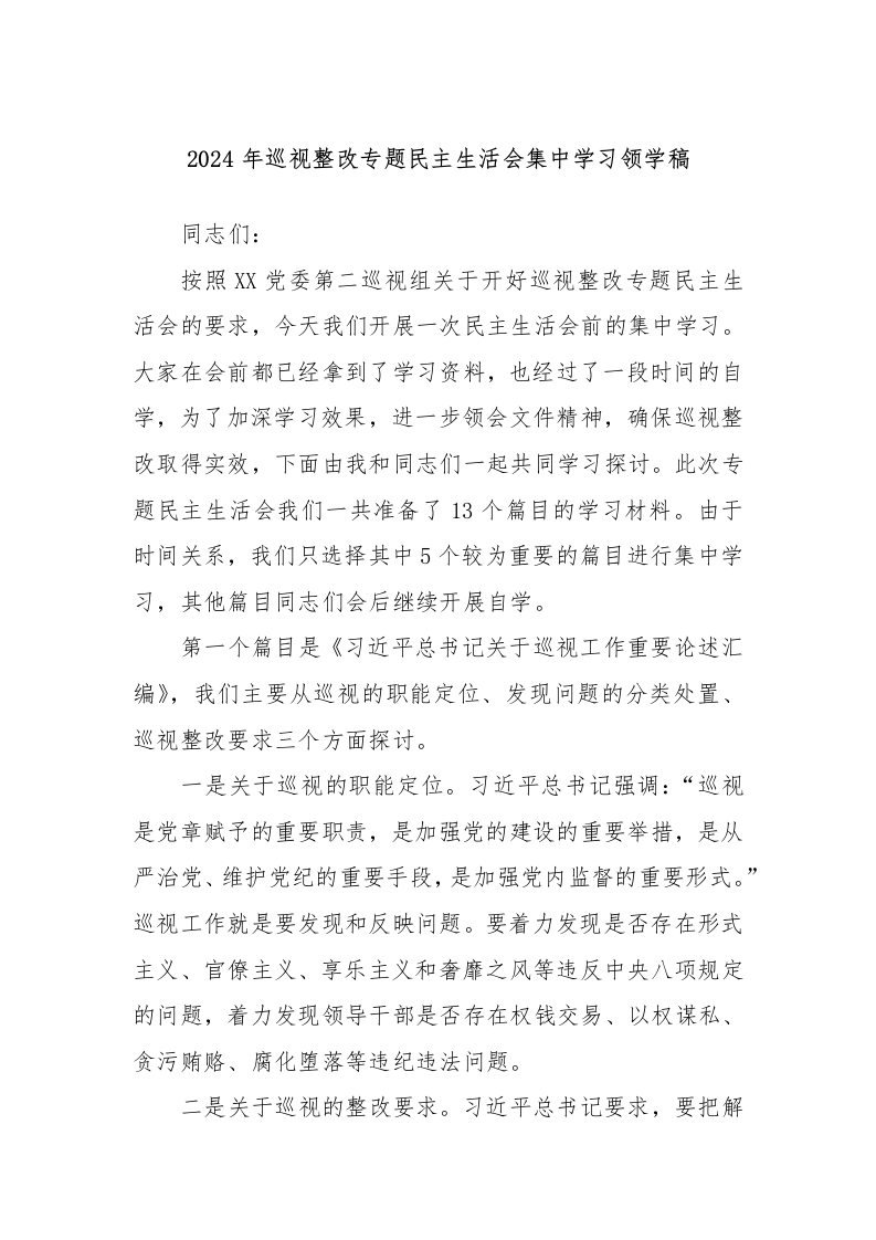 首页公文大全民主生活会2024年巡视整改专题民主生活会集中学习领学稿