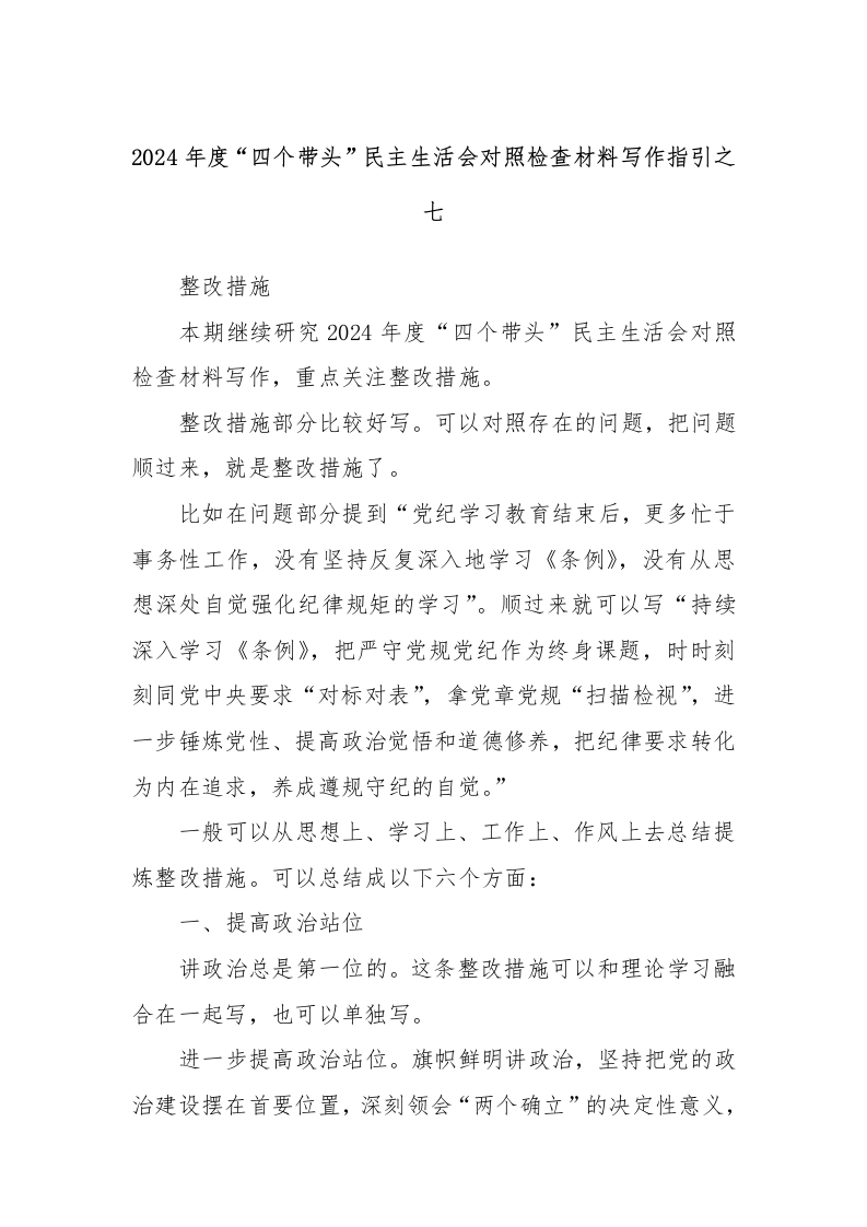2024年度“四个带头”民主生活会对照检查材料写作指引之七