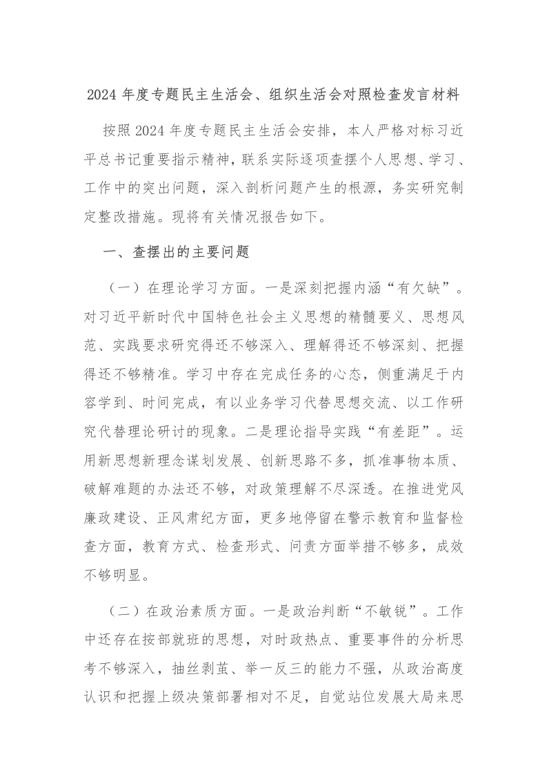 2024年度专题民主生活会、组织生活会对照检查发言材料