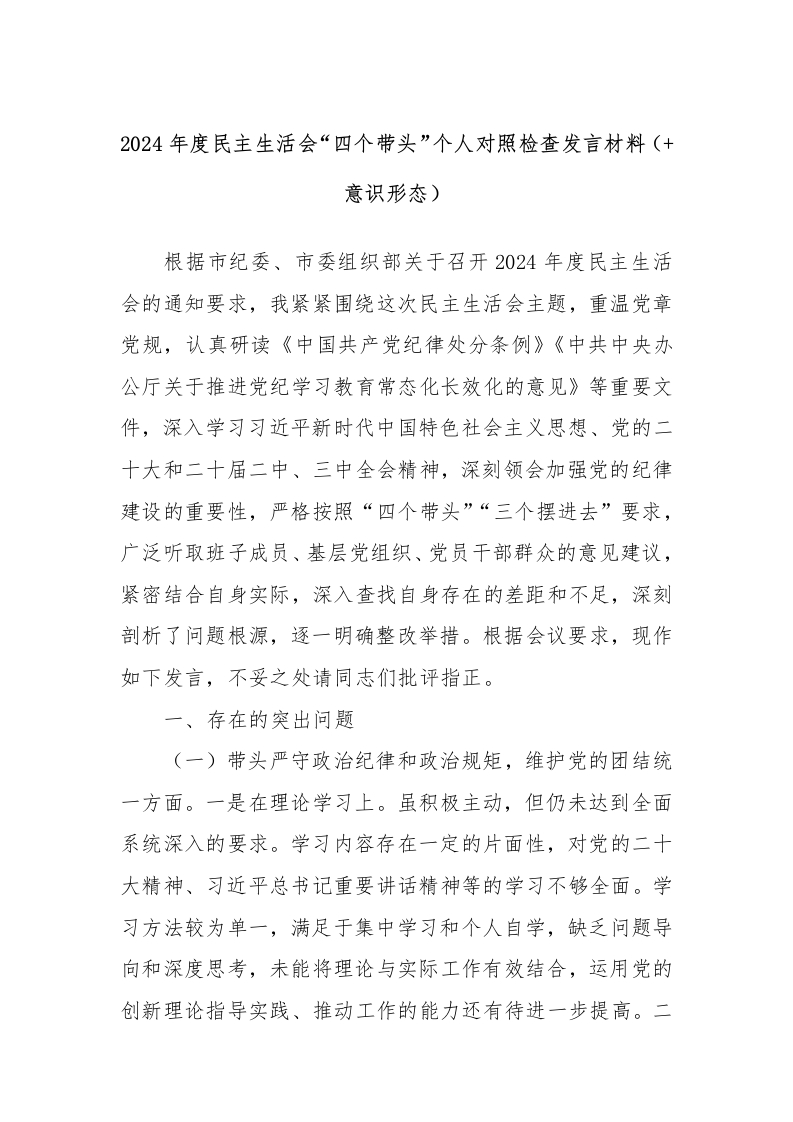 2024年度民主生活会“四个带头”个人对照检查发言材料(+意识形态)