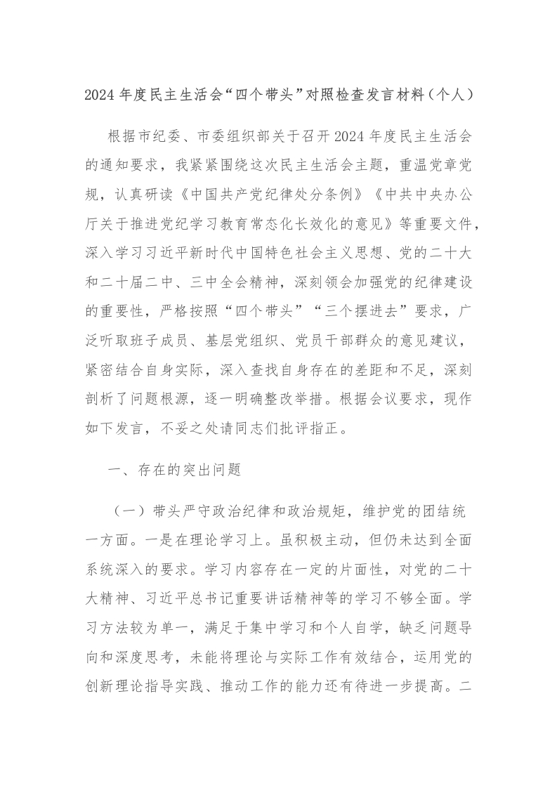 2024年度民主生活会“四个带头”对照检查发言材料(个人)