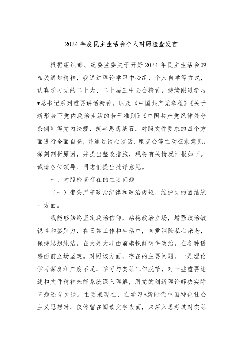 首页公文大全民主生活会2024年度民主生活会个人对照检查发言
