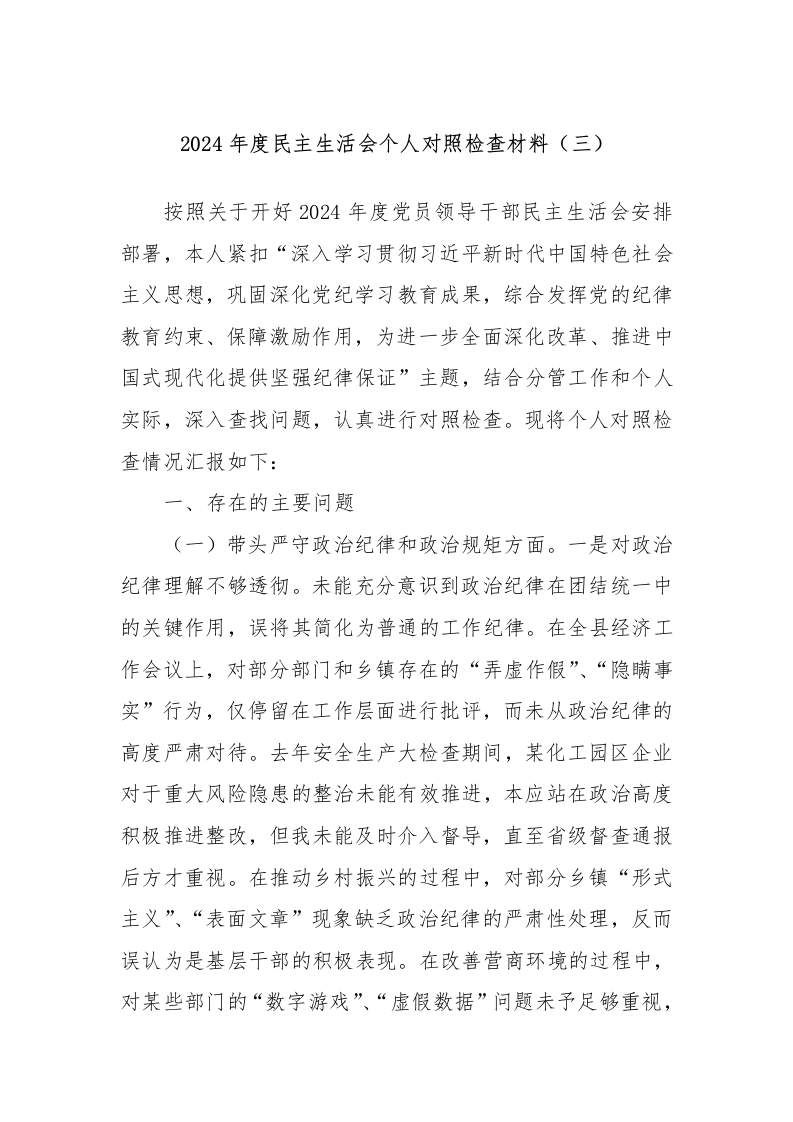 首页公文大全民主生活会2024年度民主生活会个人对照检查材料(三)