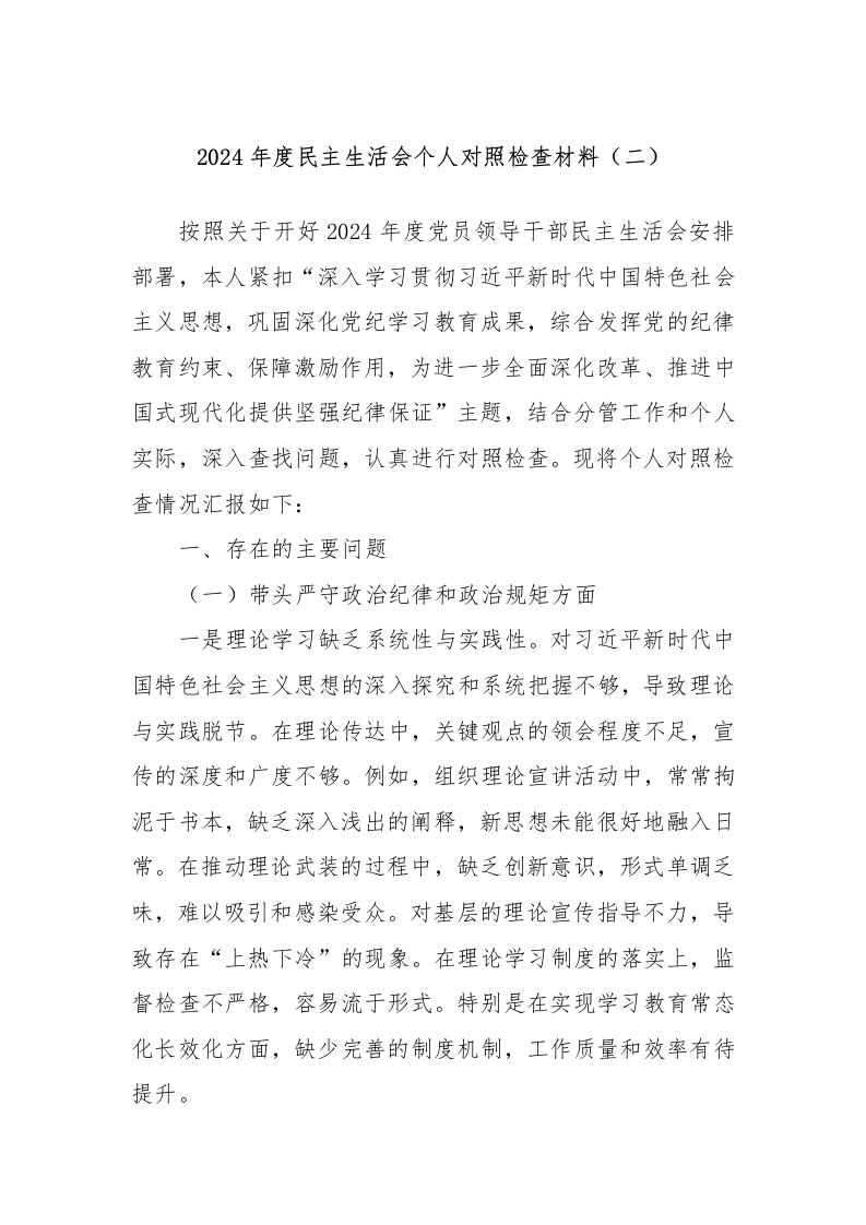 2024年度民主生活会个人对照检查材料(二)