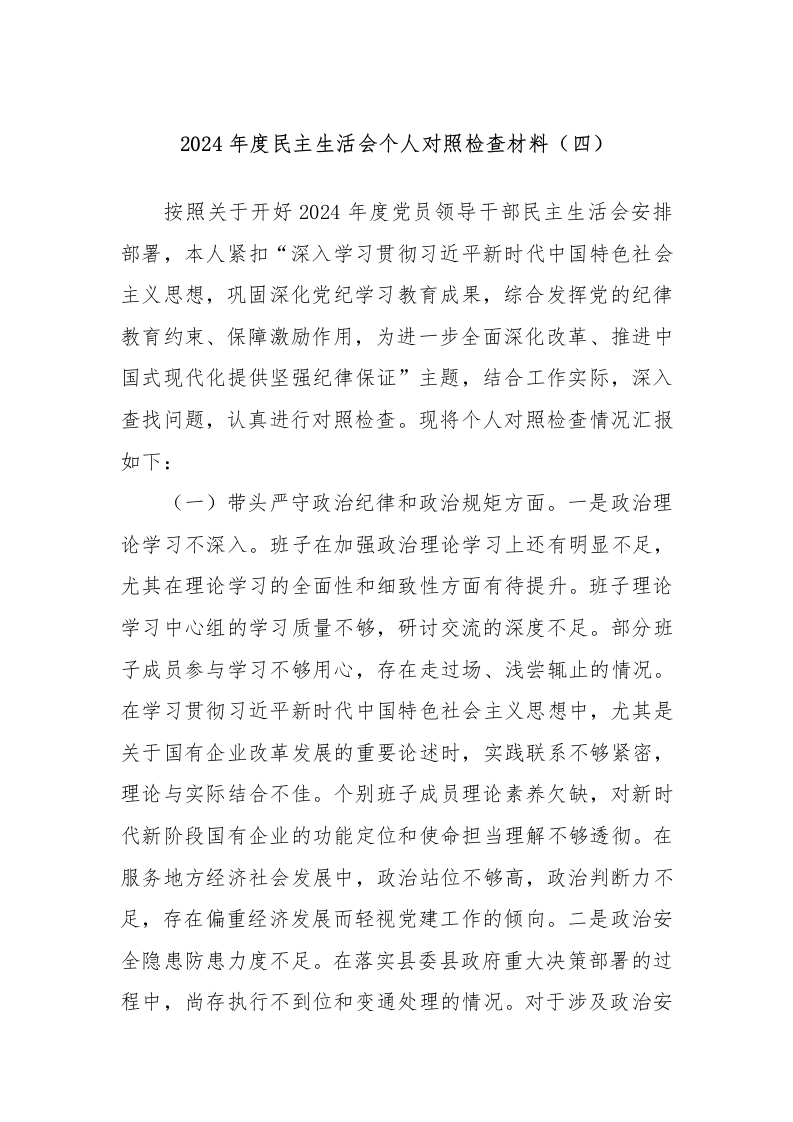 首页公文大全民主生活会2024年度民主生活会个人对照检查材料(四)