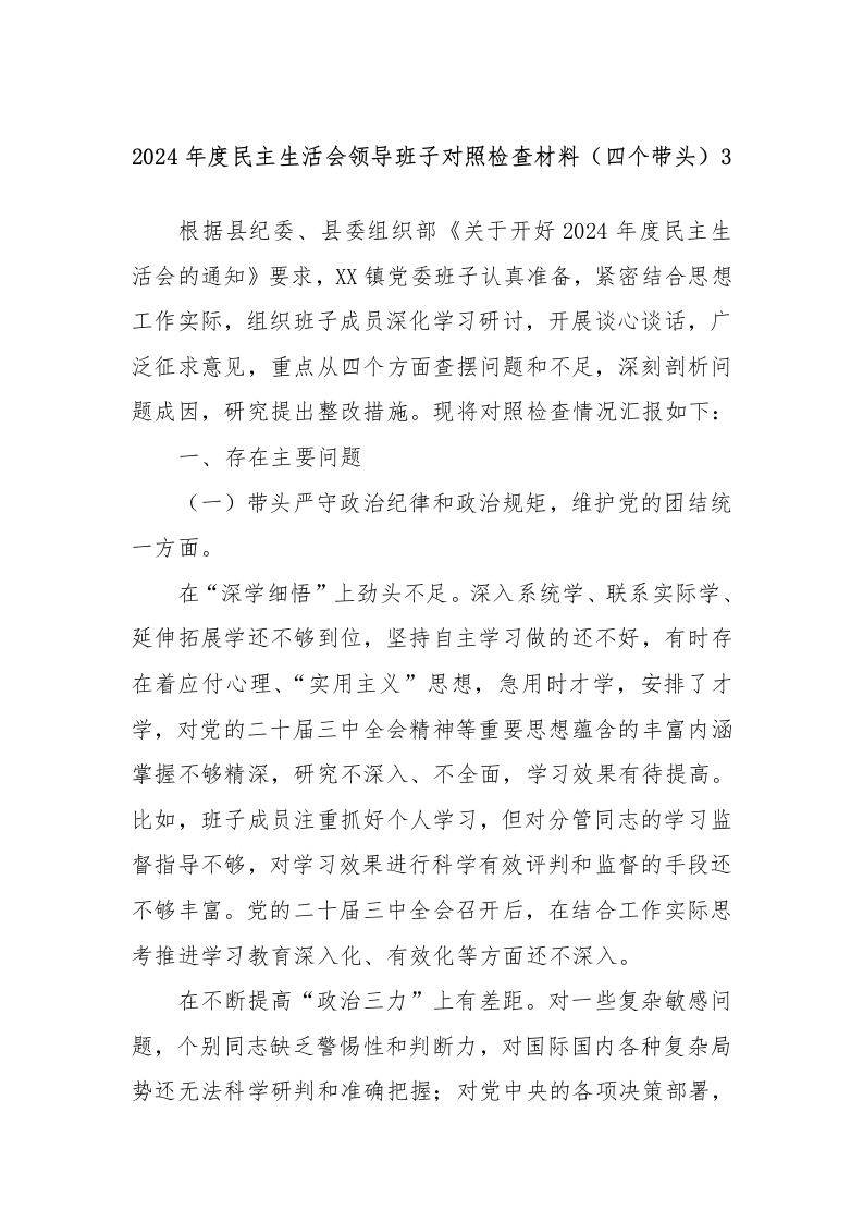 2024年度民主生活会领导班子对照检查材料(四个带头)3