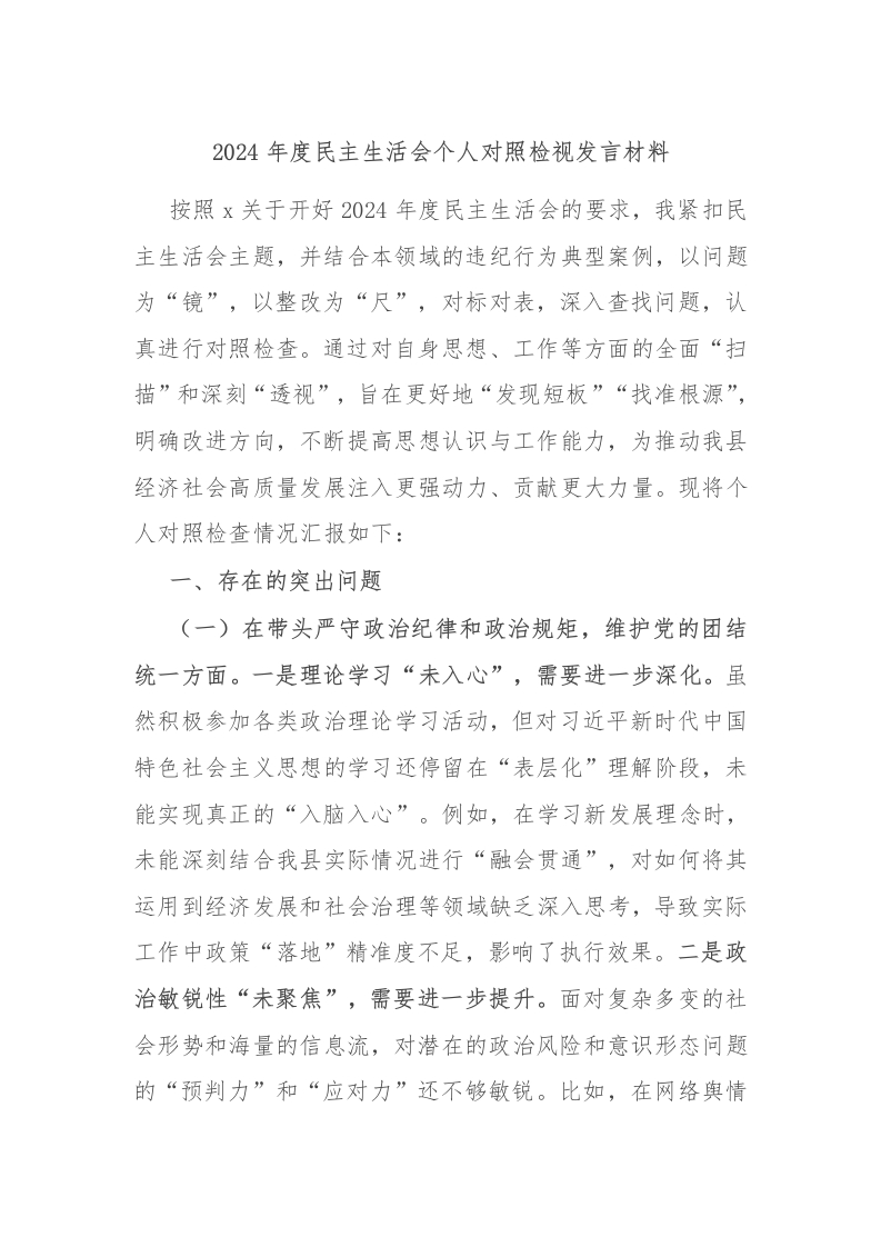 首页公文大全民主生活会2024年度民主生活会个人对照检视发言材料