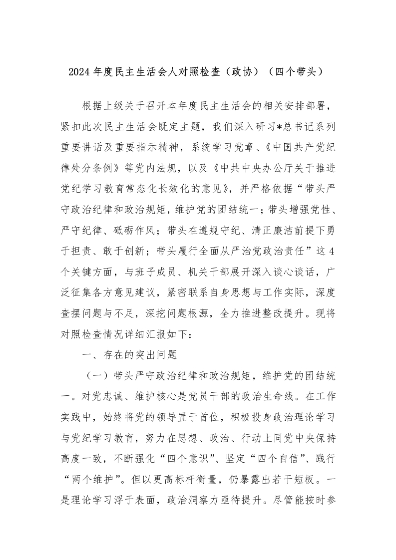 2024年度民主生活会人对照检查(政协)(四个带头)