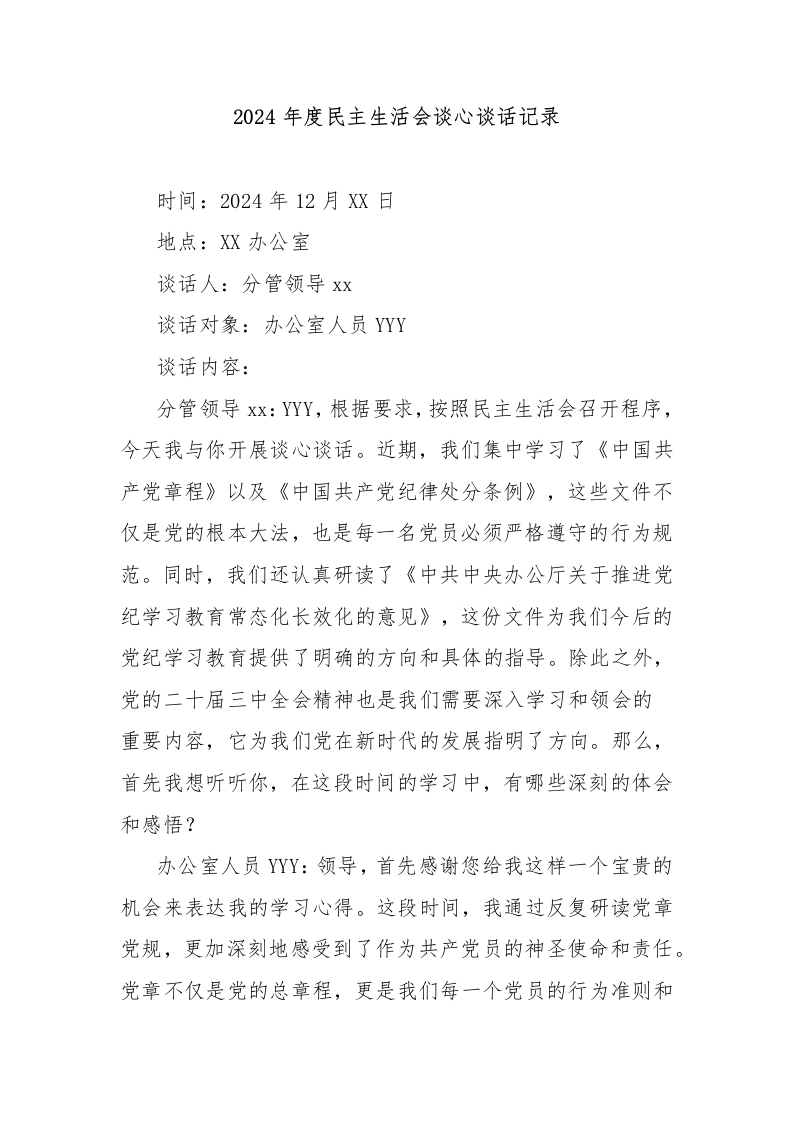 首页公文大全民主生活会2024年度民主生活会谈心谈话记录
