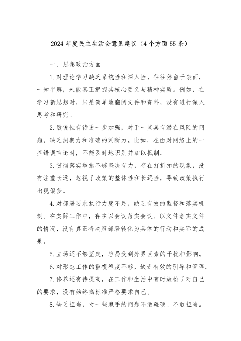 首页公文大全民主生活会2024年度民主生活会意见建议(4个方面55条)