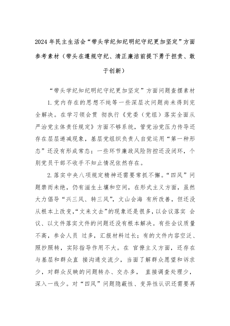 2024年民主生活会“带头学纪知纪明纪守纪更加坚定”方面参考素材(带头在遵规守纪、清正廉洁前提下勇于担责、敢于创新)