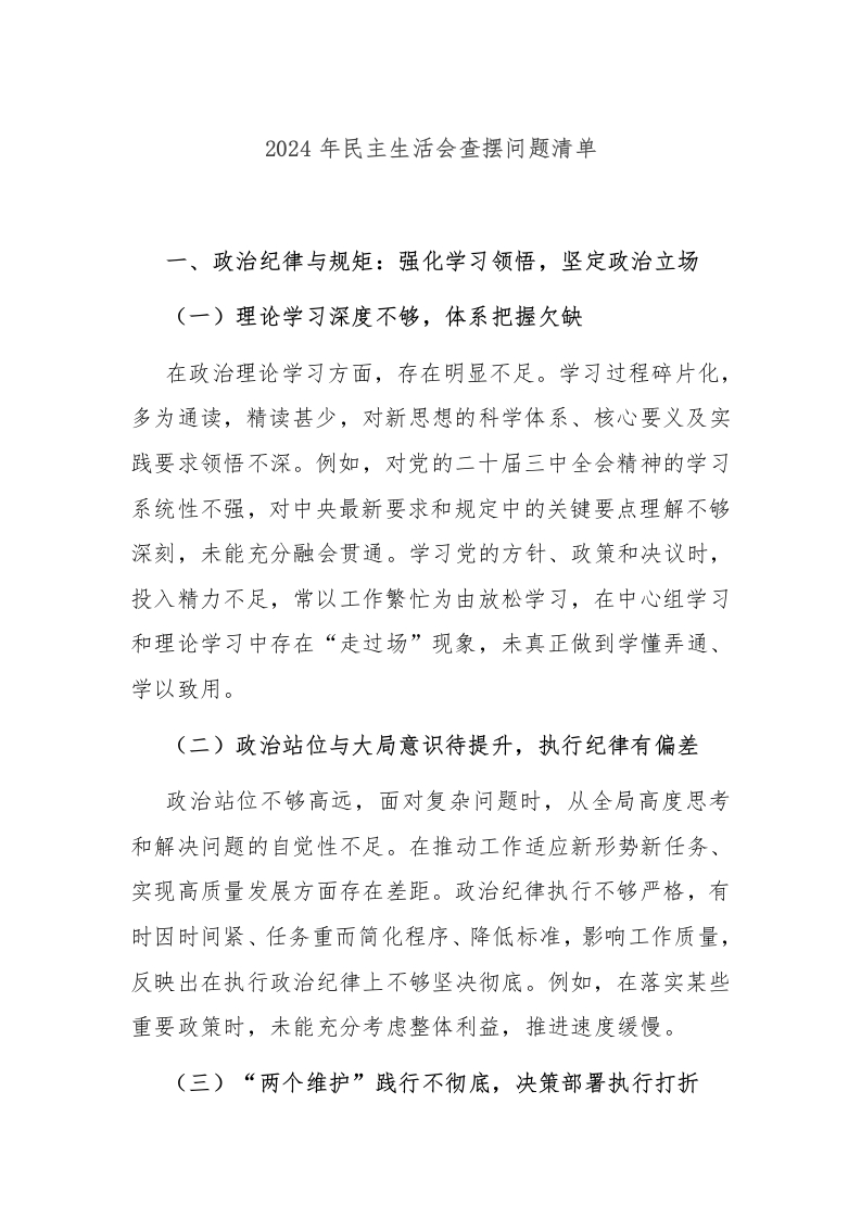 首页公文大全民主生活会2024年民主生活会查摆问题清单