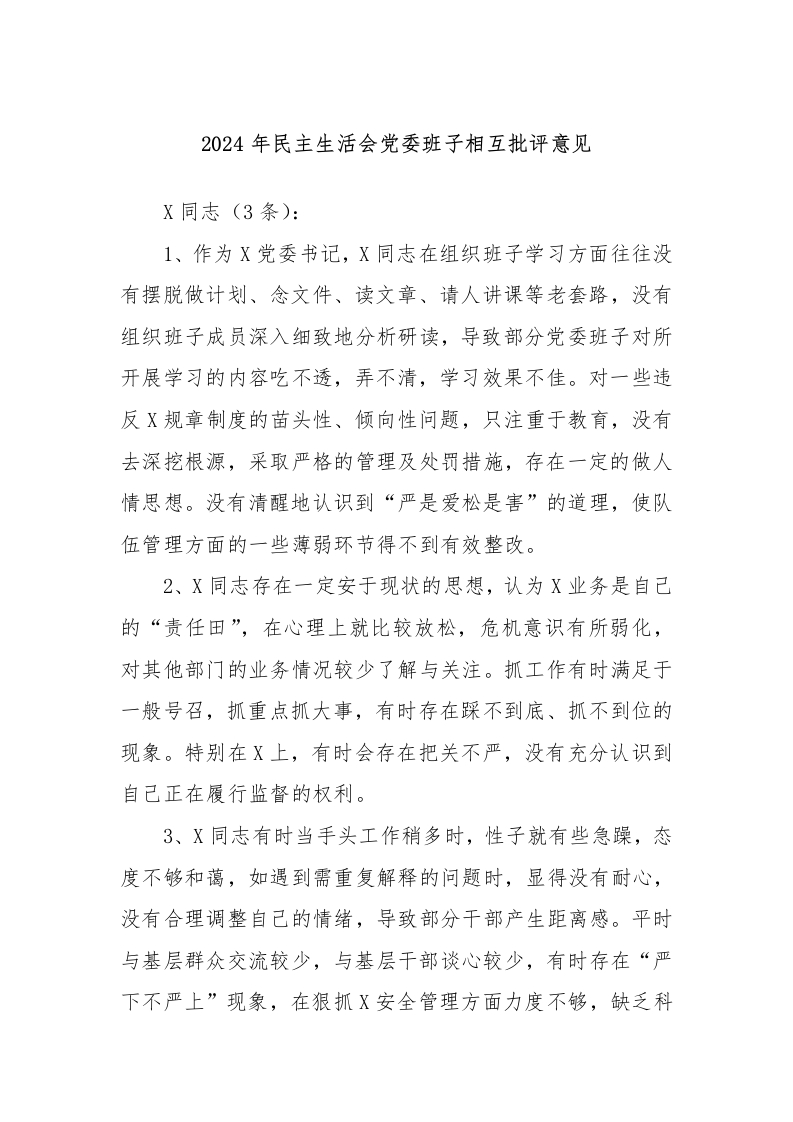 2024年民主生活会党委班子相互批评意见