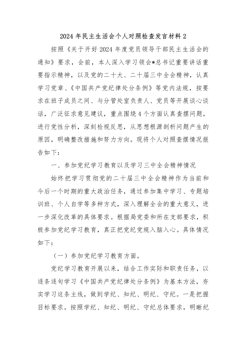 首页公文大全民主生活会2024年民主生活会个人对照检查发言材料2