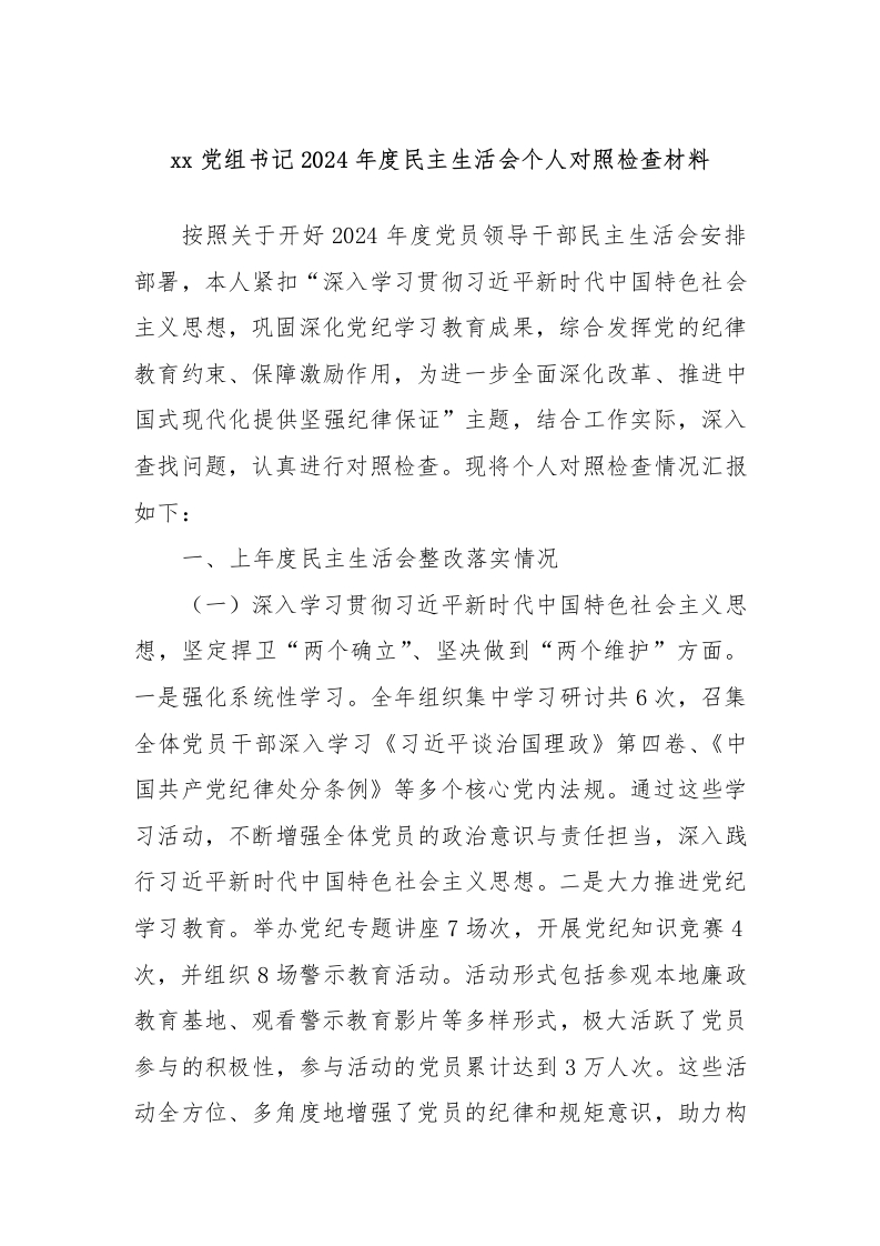 首页公文大全民主生活会xx党组书记2024年度民主生活会个人对照检查材料