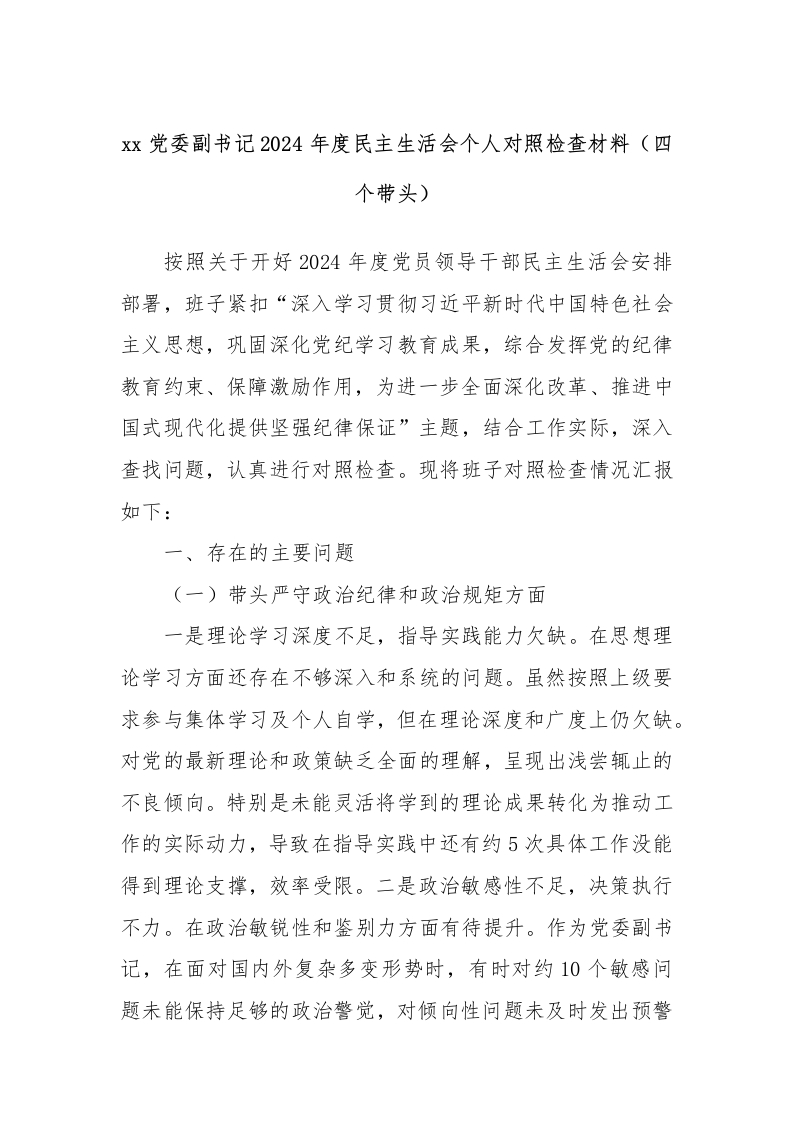 xx党委副书记2024年度民主生活会个人对照检查材料(四个带头)