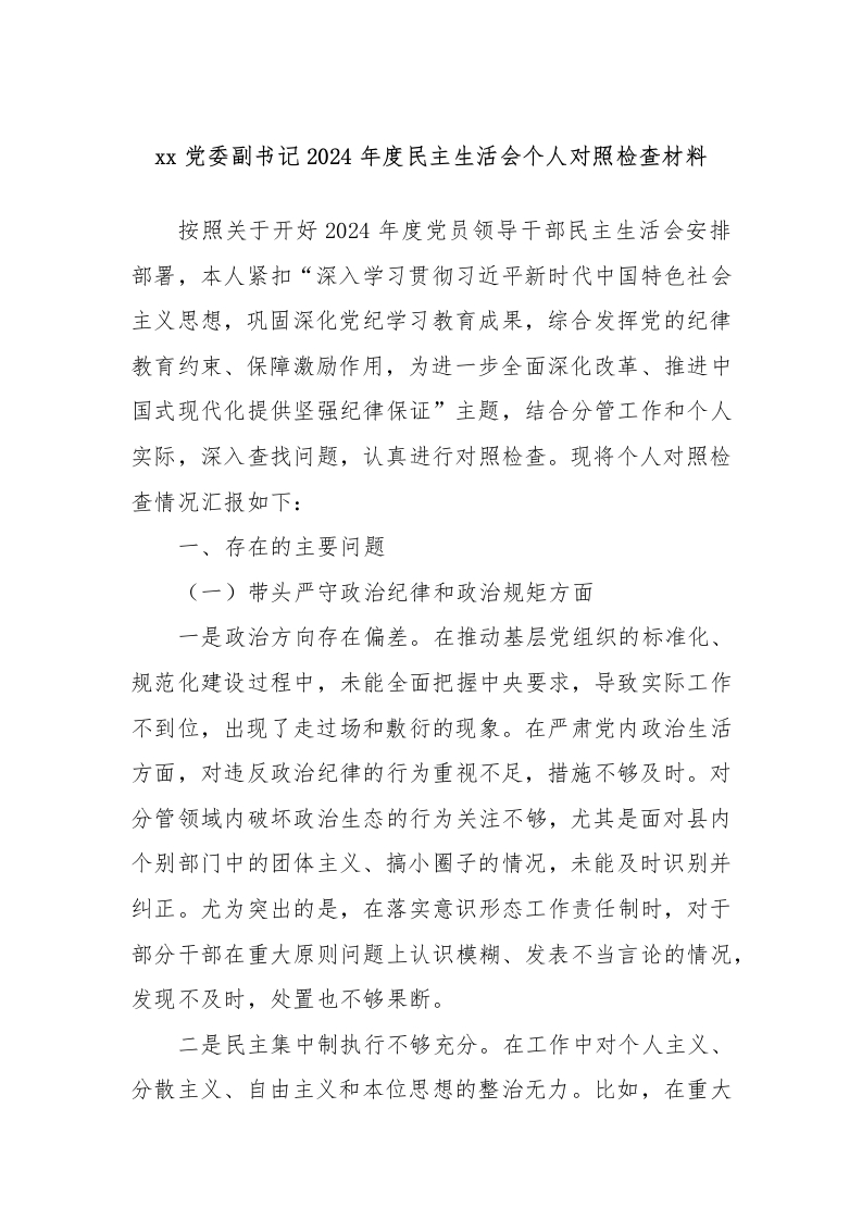 xx党委副书记2024年度民主生活会个人对照检查材料
