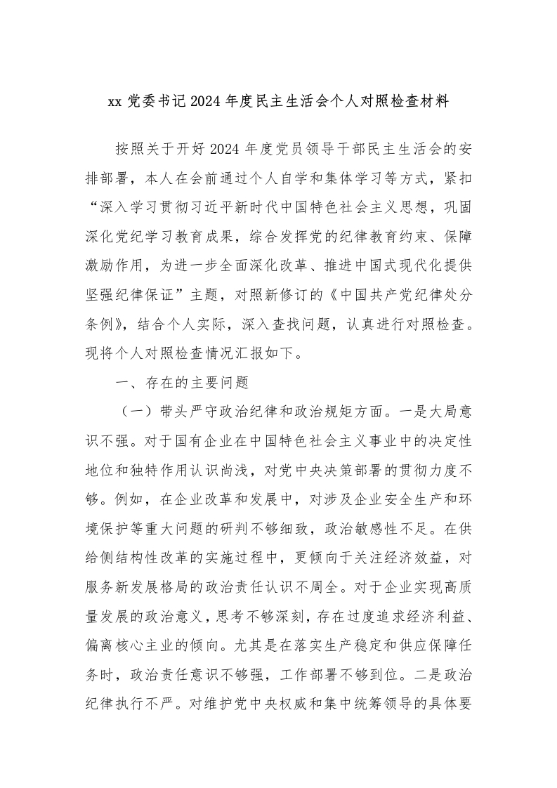 首页公文大全民主生活会xx党委书记2024年度民主生活会个人对照检查材料