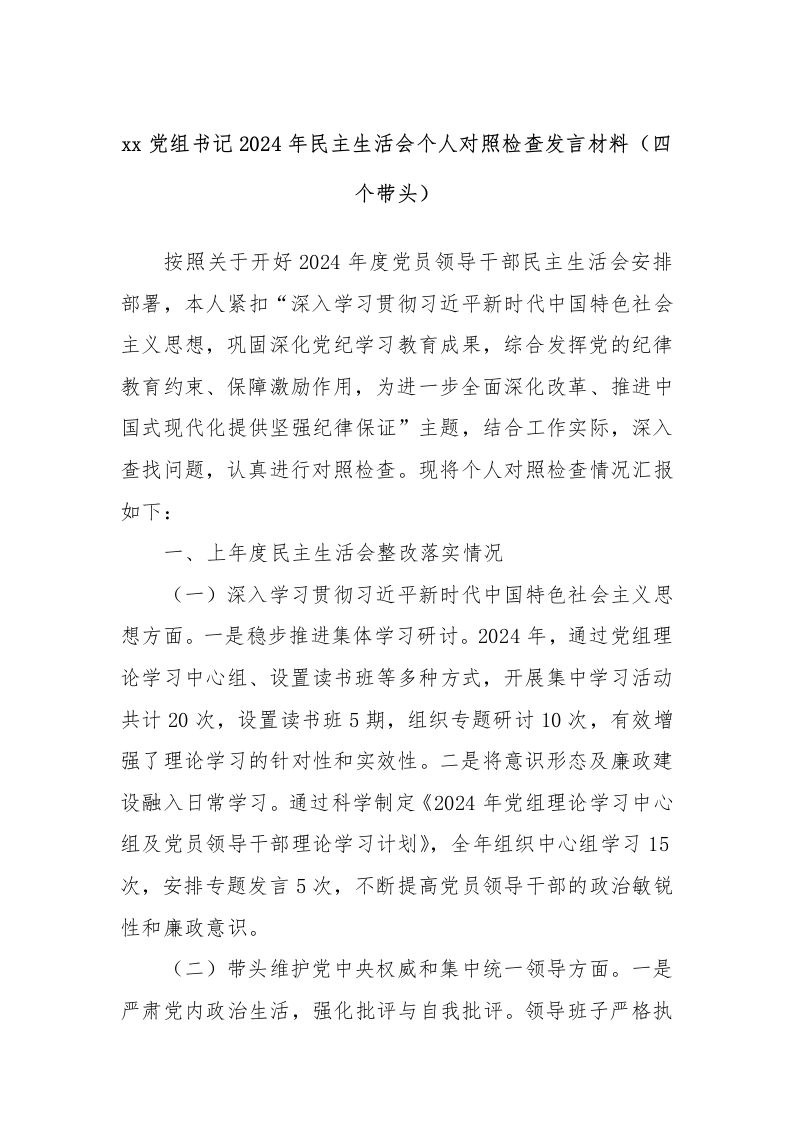 xx党组书记2024年民主生活会个人对照检查发言材料(四个带头)