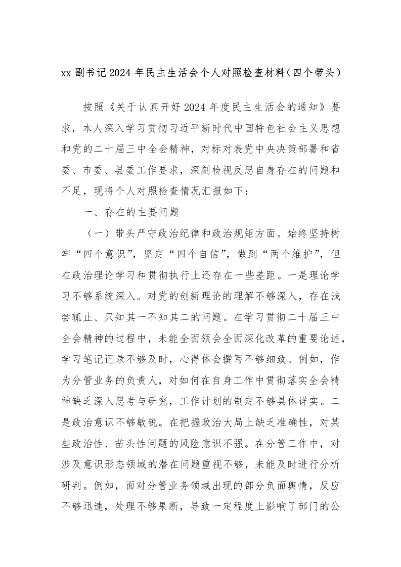 xx副书记2024年民主生活会个人对照检查材料(四个带头)