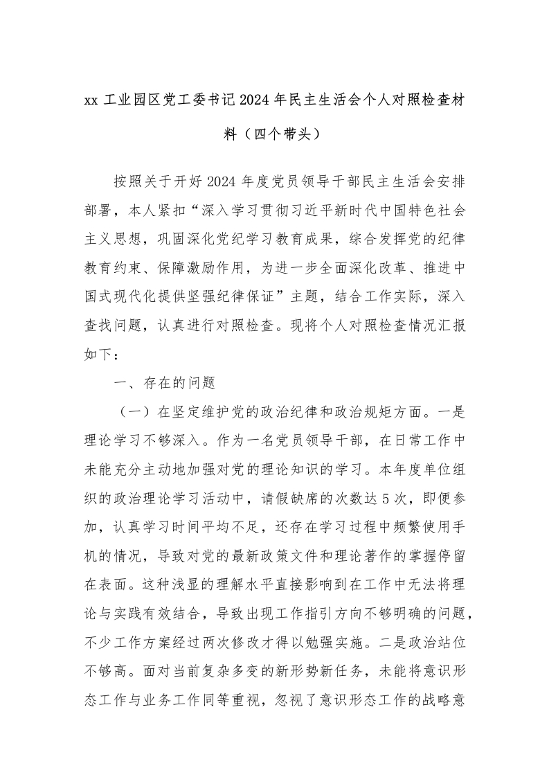 xx工业园区党工委书记2024年民主生活会个人对照检查材料(四个带头)