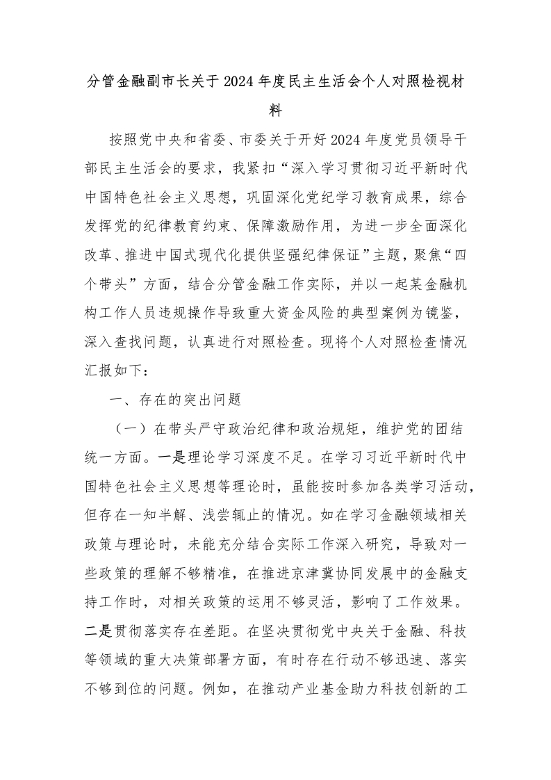 分管金融副市长关于2024年度民主生活会个人对照检视材料