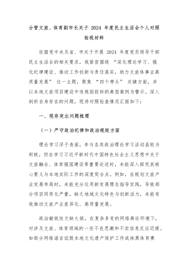 分管文旅、体育副市长关于 2024 年度民主生活会个人对照检视材料