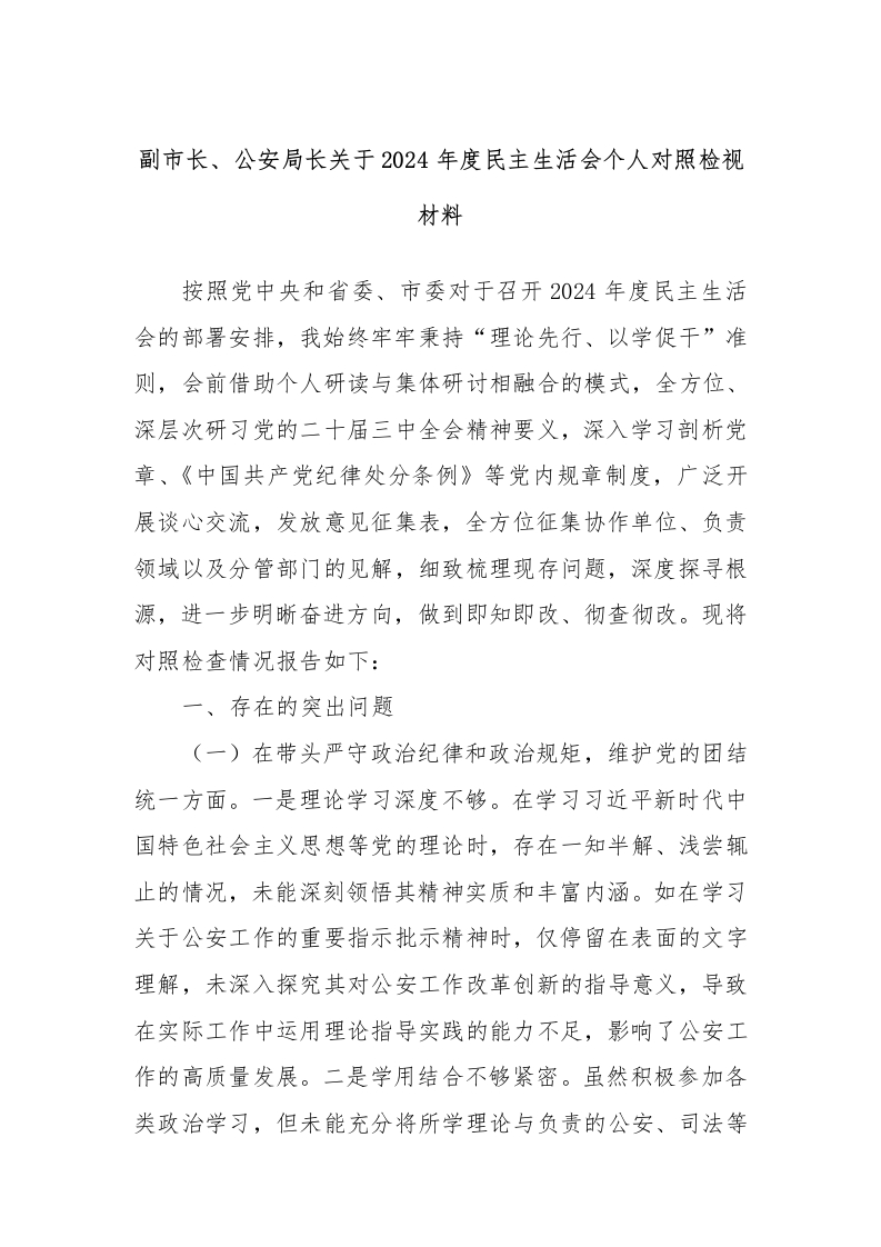 副市长、公安局长关于2024年度民主生活会个人对照检视材料