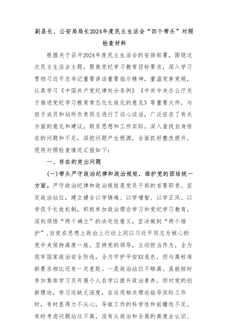 副县长、公安局局长2024年度民主生活会“四个带头”对照检查材料