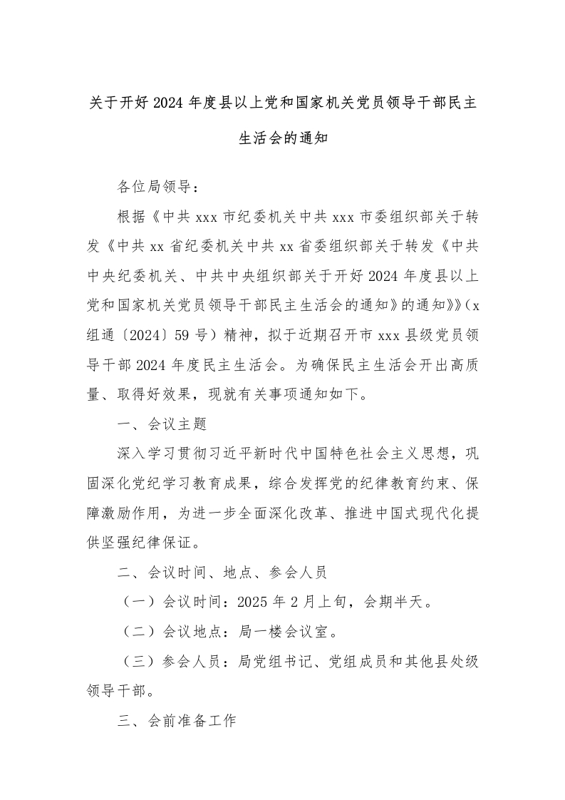 关于开好2024年度县以上党和国家机关党员领导干部民主生活会的通知