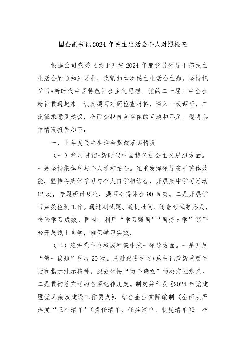首页公文大全民主生活会国企副书记2024年民主生活会个人对照检查