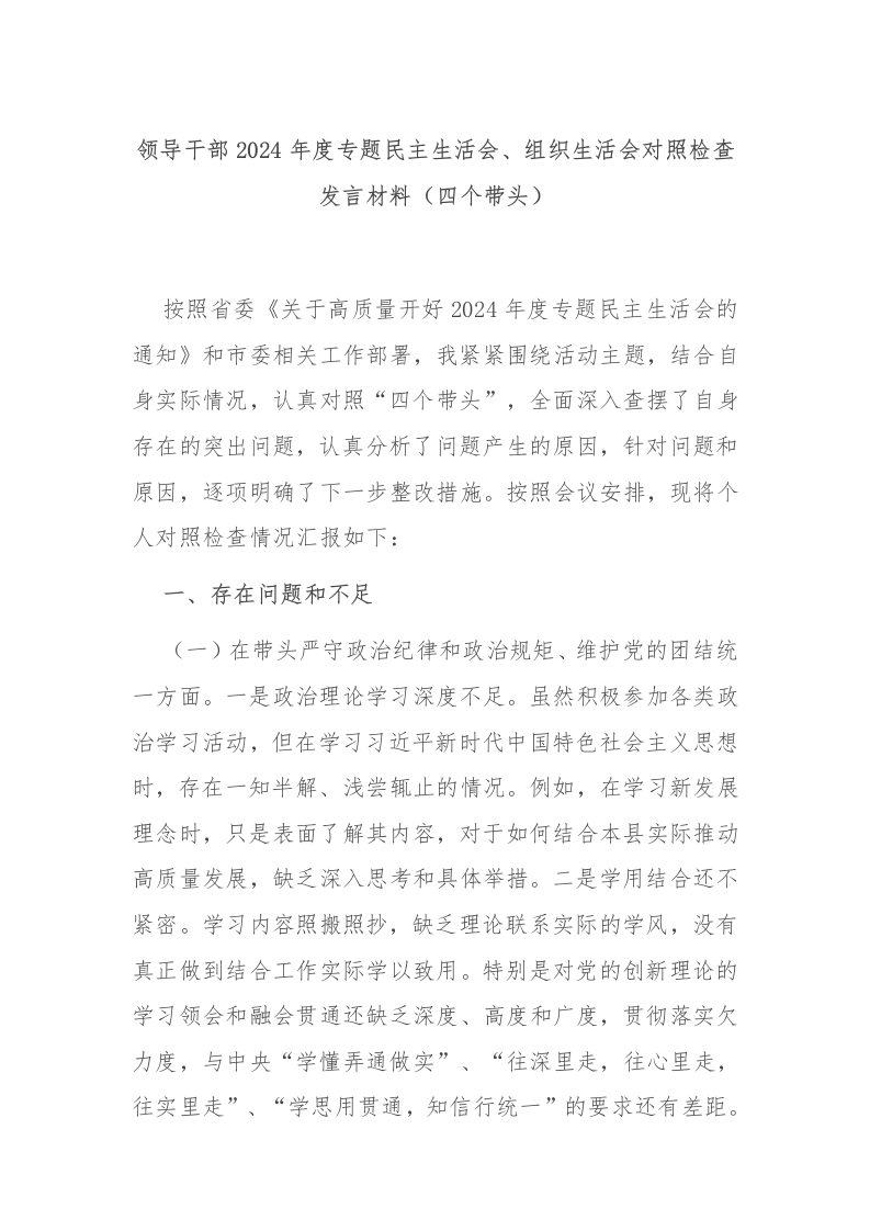 领导干部2024年度专题民主生活会、组织生活会对照检查发言材料(四个带头)