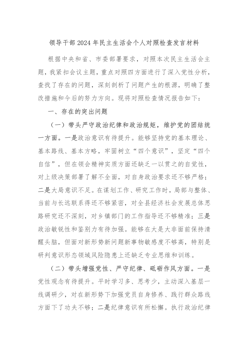 首页公文大全民主生活会领导干部2024年民主生活会个人对照检查发言材料