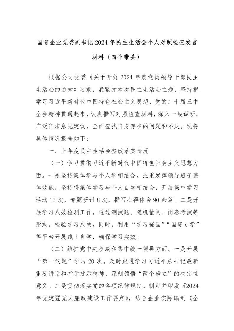 首页公文大全民主生活会国有企业党委副书记2024年民主生活会个人对照检查发言材料(四个带头)