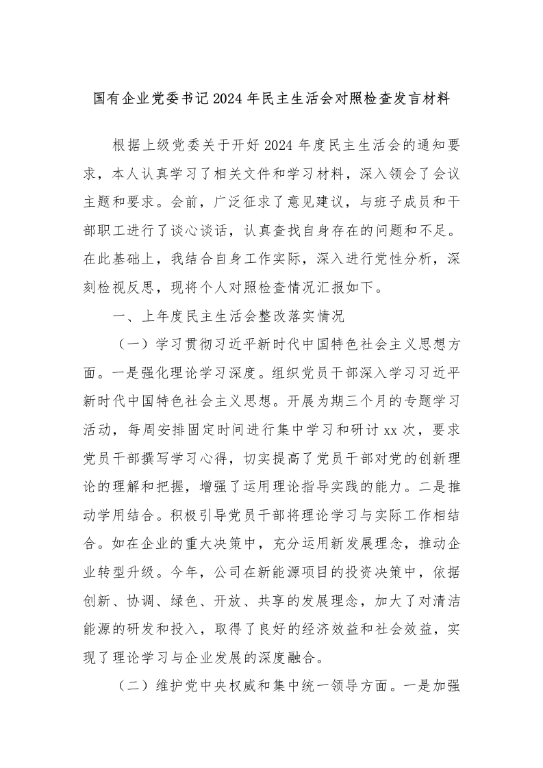 国有企业党委书记2024年民主生活会对照检查发言材料