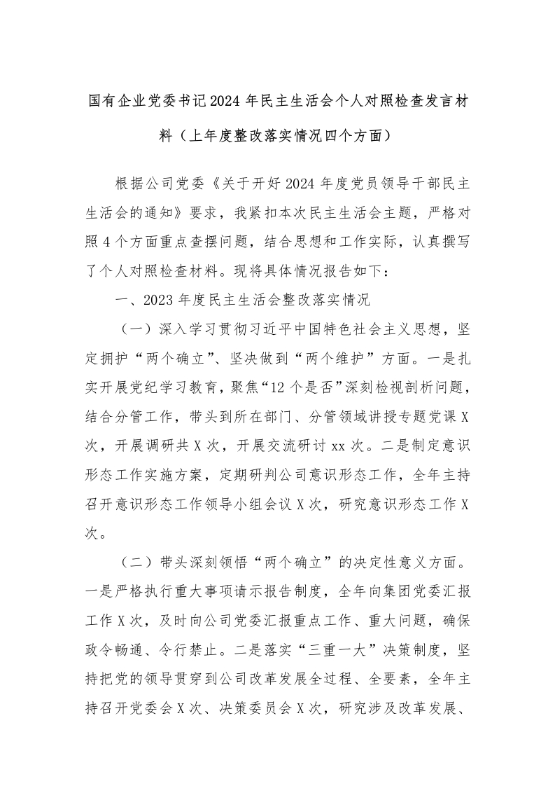 国有企业党委书记2024年民主生活会个人对照检查发言材料(上年度整改落实情况四个方面)