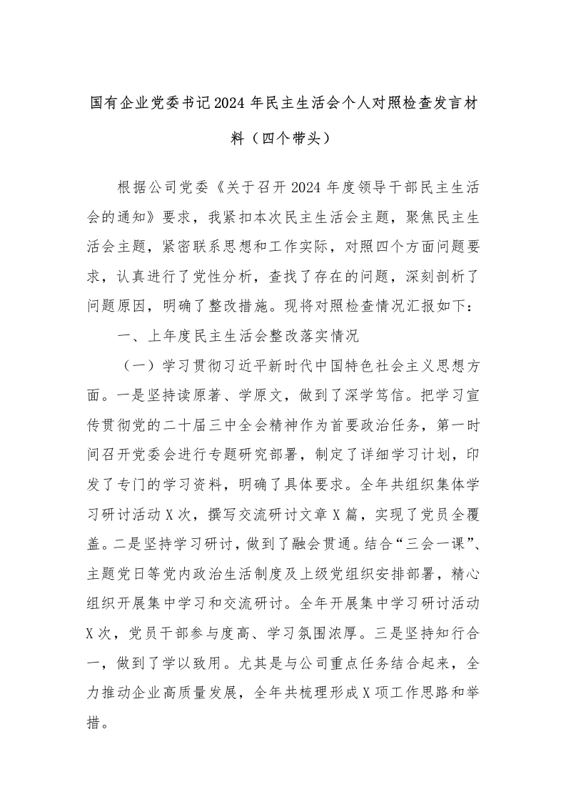 国有企业党委书记2024年民主生活会个人对照检查发言材料(四个带头)