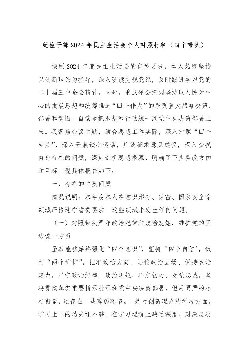 纪检干部2024年民主生活会个人对照材料(四个带头)