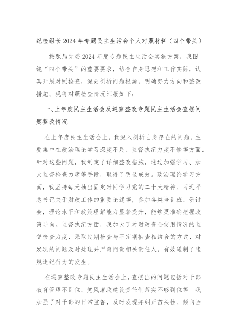纪检组长2024年专题民主生活会个人对照材料(四个带头)