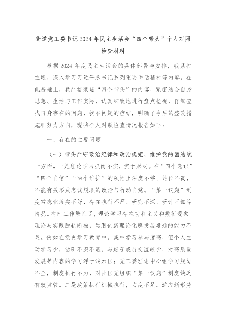 街道党工委书记2024年民主生活会“四个带头”个人对照检查材料