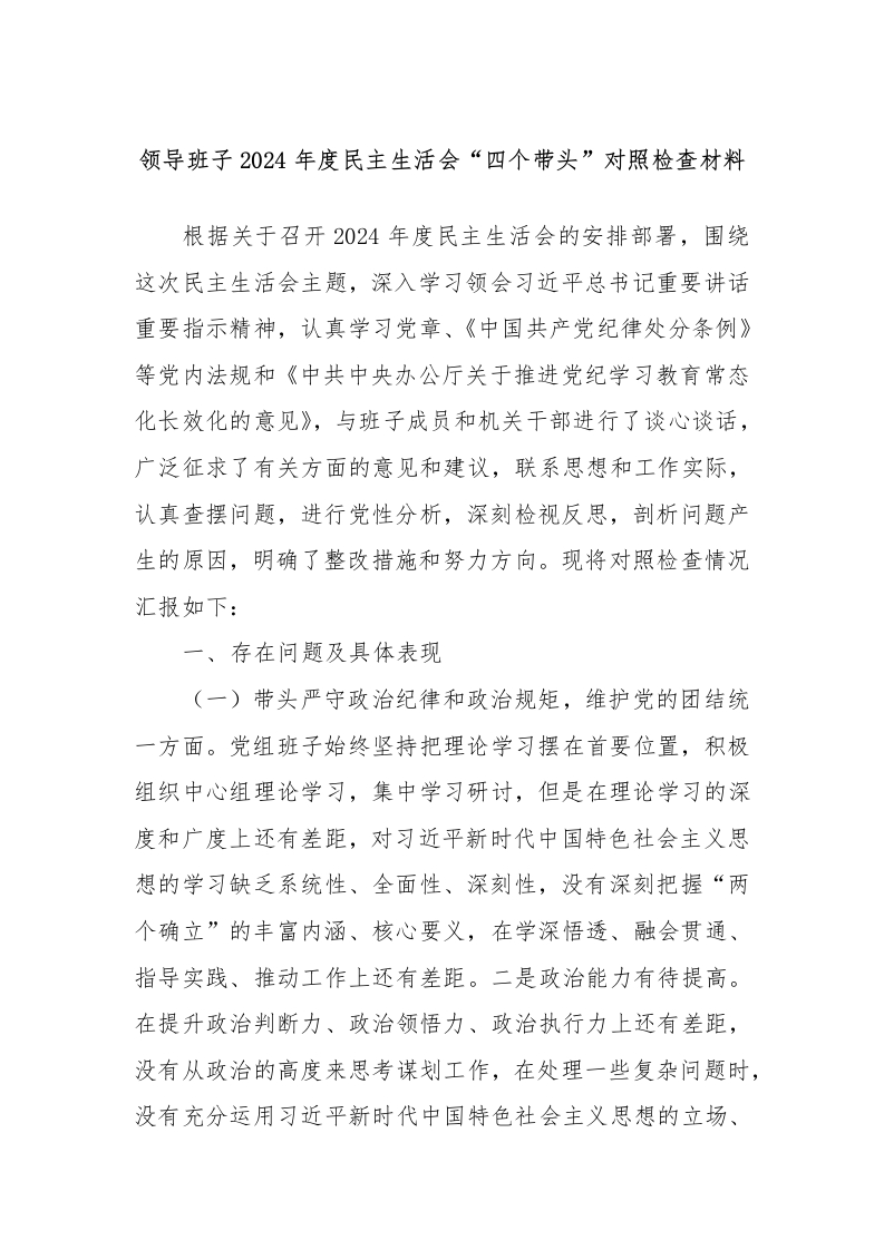 领导班子2024年度民主生活会“四个带头”对照检查材料