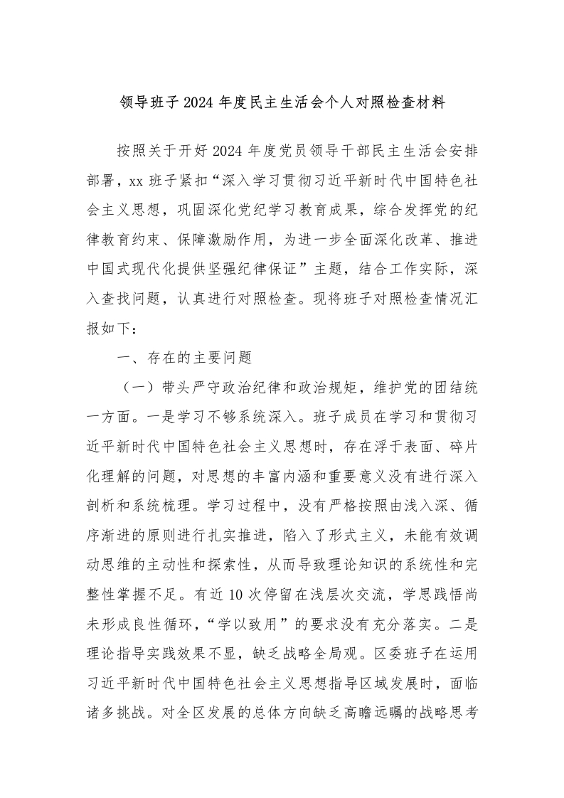 首页公文大全民主生活会领导班子2024年度民主生活会个人对照检查材料